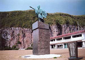 御赦免の船に向かって「足ずり」をする俊寛僧都の像は開発センターの横にある。