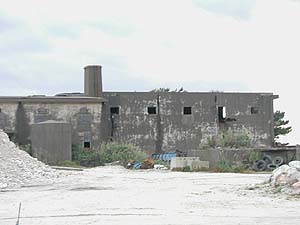 港の入口には、まるで廃墟と化したコンクリート造りの建物があります。昔この島で硫黄の採掘をしていた頃の工場跡だそうですが、現在は硫黄ではなく珪石(ガラスの原料になる)の採掘が行われているそうです。写真の左側に石ころの山が見えますが、これが珪石なのでしょう。それにしてもこれがどうやったらガラスになるのでしょうな。