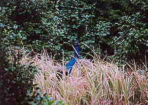 3: 集落近くの畑には小柴で組まれた柵がめぐらせてある場所も多く、案外に見通しはききません。しかしそれはクジャクの側からしても同じこと。というわけで、身をかがめ、畑の垣根の隙間からそっと中をのぞいてみましょう。上から顔を出すと一発で見つかりますが、案外「隙間からそうっとのぞく」と気づかれずに撮れるのじゃないでしょうか。ただしいうまでもないことですが、距離が遠いからといって畑への侵入は御法度です。