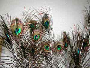 うーむ残念だけれどしょうがないなあと思っていたら、居酒屋「花女里家(かめりあ)」のマスターが、おみやげにとクジャクの羽を十数本譲ってくださいました。うーむありがたや。というわけでこの羽は、現在我が家でナミビアで買った太鼓や動物のミニチュアと同じ場所に飾られており、その結果部屋の中でどうもそのあたりだけ一種独特の雰囲気が醸し出されているわけですね(笑)。