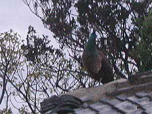 4: 念のため家屋の屋根の上も見ていきましょう。屋根の上のクジャクは位置的優位性を自覚しているからかそれほど警戒心は強くありませんし、こちら側としても障害物がないので撮影は楽です。でも、やはり200mmくらいの望遠レンズがあるに越したことはありません。