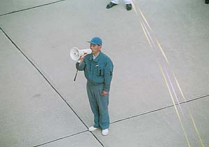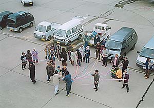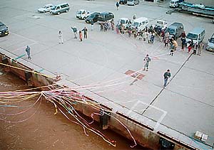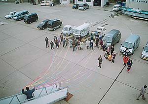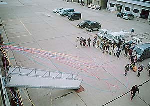 見送りの人たちが一端を持ち、そしてもう片方がどんどんのばされて…