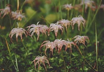 朝露に濡れるチングルマの実やワタスゲなどを見ながら歩き出す。