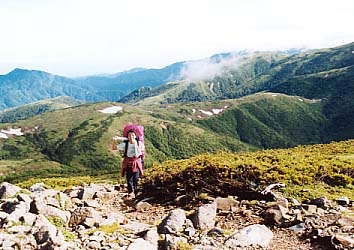 太郎山を越えて、まずは北の俣岳手前の小ピーク目指して一気の登り。振り返れば富山湾まで見渡せるという、絶妙の展望にも助けられてまずはなんとか稜線へ。いつもはこの時点でドバァっと汗が噴き出しているのだが、今回は荷が軽いからか(身体が山に慣れてきたためか)そんなこともなくまずは快調な出だし。