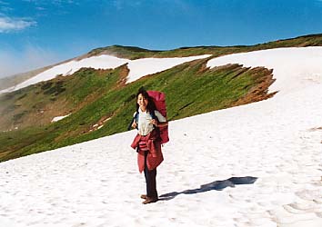 ここから北の俣岳までは、雪渓を左に見ながら緩やかな登りとなるのだが、いつもならハクサンイチゲの一大群落(単独の群落としてはおそらく北アルプスで一番大きいと思う)が広がっているはずが、雪渓の消えるのが遅くてまだちらりほらりといった感じ。ま、残念だが仕方ないなぁ。いい天気だし、しょうがないよね。