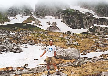 行ったことのある人なら誰でも知ってる「黒部五郎のカール(圏谷)」、笠ヶ岳の秩父平とならんで気持ちいいところBEST1の座を争うほどの快適な場所なのだ。すぐ上の雪渓からとめどなくあふれわき出す雪解け水、その脇にはシナノキンバイを中心とする花、花、花。今回も、ここで昼食の予定であった。そしてここでの飯と言ったら「つめたぁく冷やしたソーメン」、それしか考えられなかった。しかし、いざ下りてくると、湿気を帯びたつめたーい風が吹き、雪解け水こそいつも通りではあったが、「このまま食ったら、寒くてブルブル+雨でびしょぬれ」になりそうなことは明白。やむを得ず、一気に小屋まで向かってしまうことにした。悲しいことだ…。