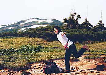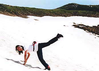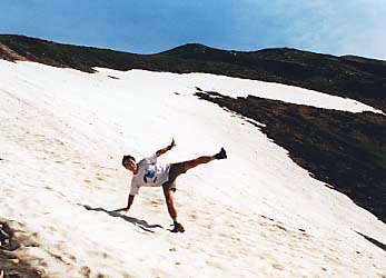 途中、雪渓の上でそれぞれこんなバカなポーズで写真を撮っていたら、100mくらい上を歩いていた人が大声で笑っているのが聞こえた。いや、笑われたんだな。おたがい30代も半ばだというのにこんなことやって遊んでるのは「大人げない」のだろうか。いや、我々はこれでいいんだと信じよう。というわけで、心新たにするTakema一行であった。