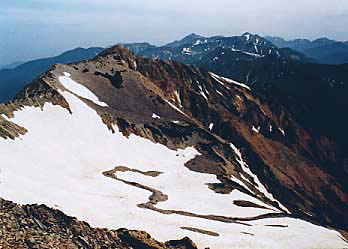そして頂上へ。このころになると上空に薄く雲がかかり始めたが、それでもとにかく暑い。頂上直下の雪渓でしばし興じるとこんなことになるのは言わずもがなといったところか。遠くには槍ヶ岳が見え、「はぁ、おいおいあそこまで行かなきゃいけないんだな」と、嬉し悲しという感じである。