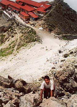 おおっ、久々に見ましたなぁブロッケン現象!ここ現象は、太陽−自分−ガスが一直線に並んだときに見える現象なのですが、太陽の位置もあって、平地ではまず見ることができません。かつてヨーロッパ人が海上でこの現象に遭遇してこのような名前を付けたわけです。ま、虹の一種みたいなもので、この写真では撮りきれませんでしたが、真ん中に映る自分の影の周りには丸い虹が浮かびます。で、自分が手を振れば影も同じ動きをするわけで、昔の人はこれに神的な扱いをしていました(名前は忘れてしまいましたが)。ガスっている時に突然晴れ間がのぞいたとき、ガスの渦巻く谷の方を見ると、運が良ければ見ることができます。ま、実際はもっと小さくしか映らなかったんですけれどね。ズームで撮ったんで多少インチキです(爆)。