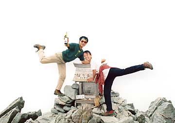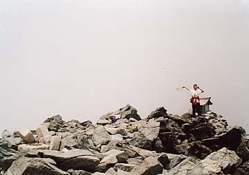 そんなわけで、頂上もほぼ数人でのがらがら状態。さらにしばらくの間は、誰も登ってこない、完全に独占の状態になったのでありました。あたりはガスが上がってきてしまい、切れ目から下がときどき見えるくらいの展望しかなかったとはいえ、8/1という、夏山シーズン真っ盛りの真っ昼間に槍の頂上貸し切りというのはそうそうあるもんじゃないでしょう。というわけで、赤ワイン飲んでゆっくり。しばらくたって、人が上がってきたので祠付近でバカな写真を撮ってもらい、思い残すことなく下山。