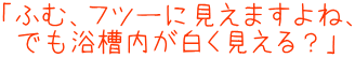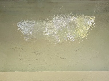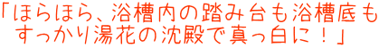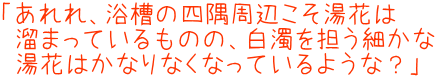 そうなのです。湯の中で長く舞いやすい「細かく軽い白湯花」は最初のオーバーフローとともに流れ出してしまったようで、浴槽内は案外に透明な湯と大きく重たげな白湯花(オーバーフローしにくい)が残されている感じでありました。かき回せばそこそこの湯花が舞う状況ではありますが、こりゃ「にごり湯」とはいいにくいかもなぁ。 |