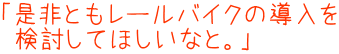 それも可能であれば自転車方式ではなく、旧美幸線のレールバイクのように「エンジン付き」だといいなぁ(経費は掛かりますが)。土日祝運行となれば、そこそこ人は呼べるのでは?(地の利は別に悪くないですし)。それこそ田んぼの中をトコトコと走るのはなかなか他のレールバイクにはない特徴となるのではないかと思いますがどんなものでしょうかね。 |