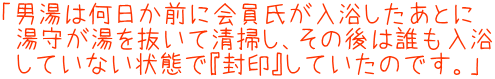 ところで「女湯はともかく、男湯の掃除はどうしたの?」という疑問をお持ちの方もおられると思いますが‥今回は「とあるお試し企画」の関係で男湯の掃除はしませんでした。というか正しくは‥ |