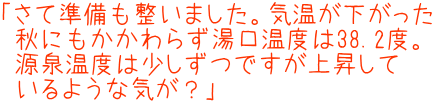 湯守としては「駒の湯の新鮮湯を楽しんでほしい」という思いから透明湯にこだわりを持って維持管理をなさってきたはずですが、温泉ファンの端くれたるTakemaとしてはちょっと別の思いもありました。それは‥ |