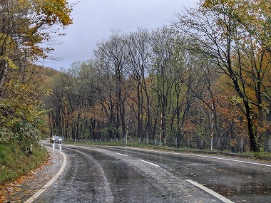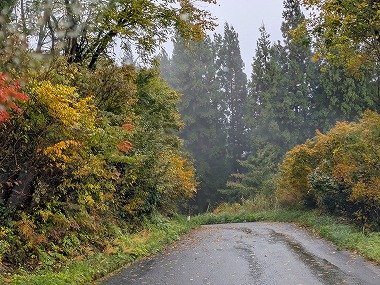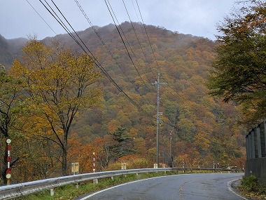 さてトンネルを抜けて越後側へ。トンネル手前から路面は濡れていましたが、こちらもやっぱり小雨模様です(日本海側の天気のほうが悪い気圧配置)。ただこの日はこのエリアが一番どんよりしていたかな(このあと曇りベースに回復)。 |