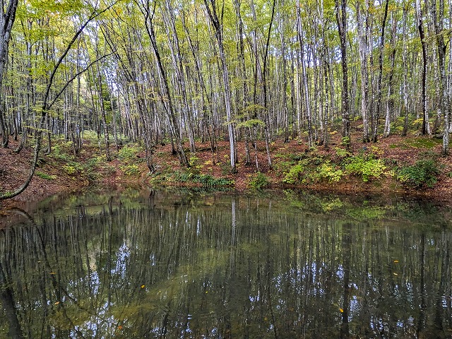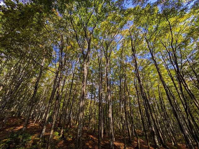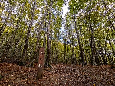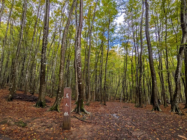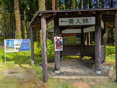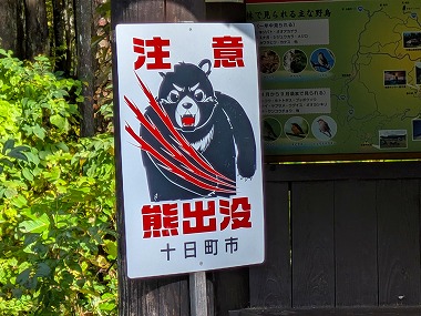 というわけで美人林入口の駐車場へ。「熊出没注意」の看板に書かれた熊の絵は爪の鋭さを強調したものでリアリティがあります。よくプーさんとかくまモンのようにかわいらしくデフォルメされたイラスト絵を見たりしますが、少なくとも「注意(危険)を促す看板」にはかわいらしいイラストを使ってほしくはないものです。 |