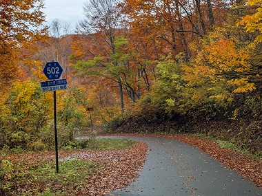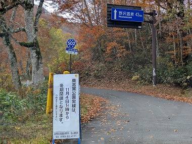 さていよいよ奥志賀林道(県道502号)との合流地点までやってきました。ええっと11/4午後から閉鎖です。この日は11/2ですからあと2日で閉鎖というわけです。ここから志賀高原に抜けたことはありますが野沢温泉方面は初めての走行で、舗装路とはいえワインディング路メインの43kmはなかなかに遠いぞ(自ら選んだ道ですが)。 |
