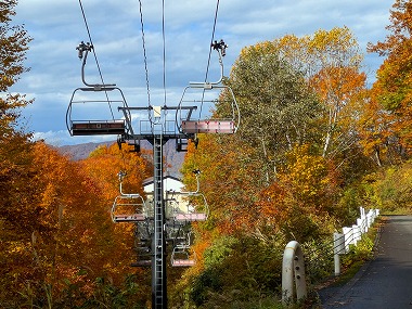 さらに下っていくと、完全にスキーゲレンデ内に入ったようで、道路のすぐ上をリフトが交差しています。シーズン入りすると、この空中を通っていく人々は、ここに県道があることすら気づかないのでしょうね(積雪量にもよりますが)。そうしてさらに進んでいくと‥ |