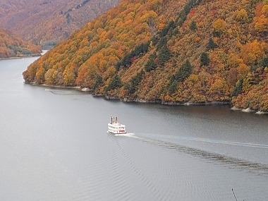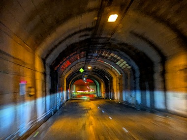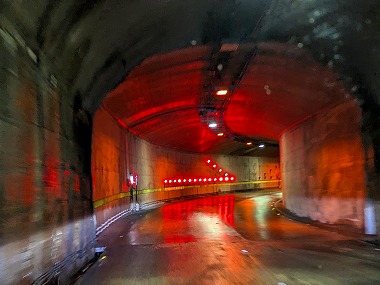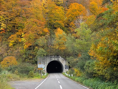 しばらくは奥只見湖沿いを行くので、時折湖面も見えたりします。しばらく行くと銀山平~檜枝岐、いやR352号の魚沼~檜枝岐間で唯一のトンネルが出てきましたが、電源もない区間ゆえそもそも照明設備自体がなくトンネル内は真っ暗です(右上画像マウスオーバーで画像が変わります)。 |
