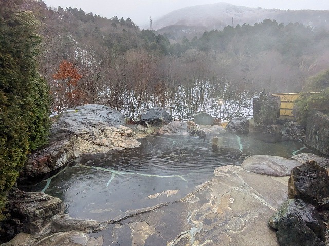 そんなわけで朝食後に再訪。知ってはいましたが、この屋根付き半露天風呂(この時期は窓も全閉でしたが)、当然外よりも暖かい浴室でありこれもいい!広いけれど圧倒的に寒い露天風呂の(前日の)男湯にも何とかこういう設え(しつらえ)をしてもらえないかなと思います。 |