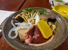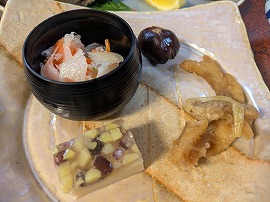 長さはもちろん身も太いイワナでしたが火の通りは絶妙で、身もパサパサ感とは無縁、当然焼きたての提供なので十分に温かく、「これは今すぐ食べねば!」ということで、気がつけば先付けの料理よりも先に一気に平らげてしまいました(笑)。 |