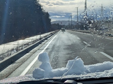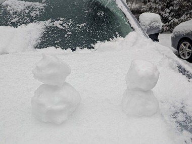 さてそれでは出発‥の前に雪下ろしからですね。ちゃんとルーフの雪も落としておかないと思いがけない事故のもととなります。でもしかし、おしんこどんがボンネットの‥ |