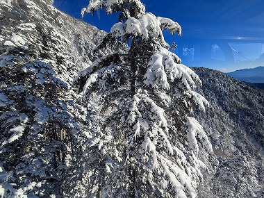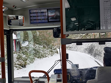 菅の台BC(のすぐ先)からしらび平駅までは一般車通行止めですからバスで向かいます。オンラインで事前にチケットを入手しておくことも可能なようですが、冬は閑散期ゆえ最安値となっており割引はなかったようでした。10数名の乗車でしらび平駅へと向かいます。 |