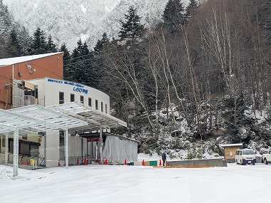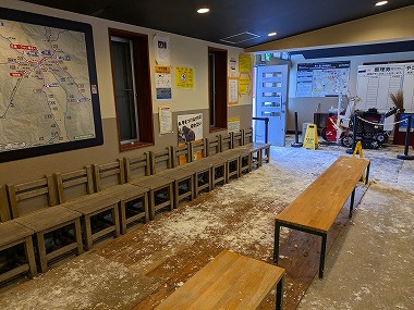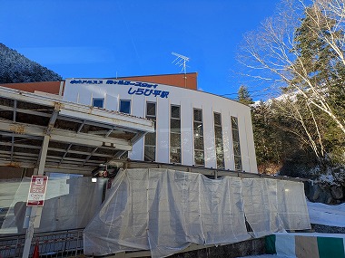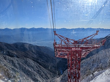 菅の台BCではほぼなかった雪も、さすがに山を上がるにつれてしっかり雪道となりやがてしらび平駅に到着です。乗客が少ないこともあり次のロープウェイ便がガラガラなこともわかっていたので、皆さんのんびりという感じでした。 |