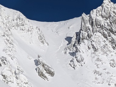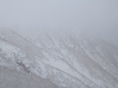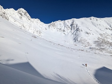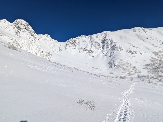 とはいえ筋力も(右足で踏ん張れない)装備もないので行くことはできません(そもそも行こうという気力がない)。というわけで、先行者のトレースを少しだけ辿りわずかにカール内へ。 |