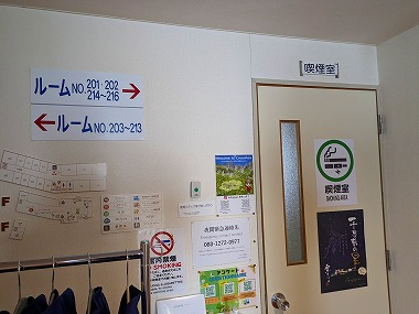部屋は角の5人部屋なのでちょっとぜいたく部屋です(一般部屋ながら少し広いはず)。なお廊下には定間隔というか部屋の前ごとに消火器が設置されています。いざという時の初期消火を大前提としていることが見てとれます。消火用の溜め水も多くはないでしょうしそもそもこの時期は凍りますし。 |