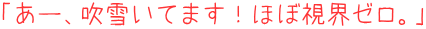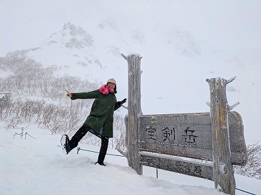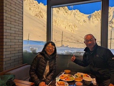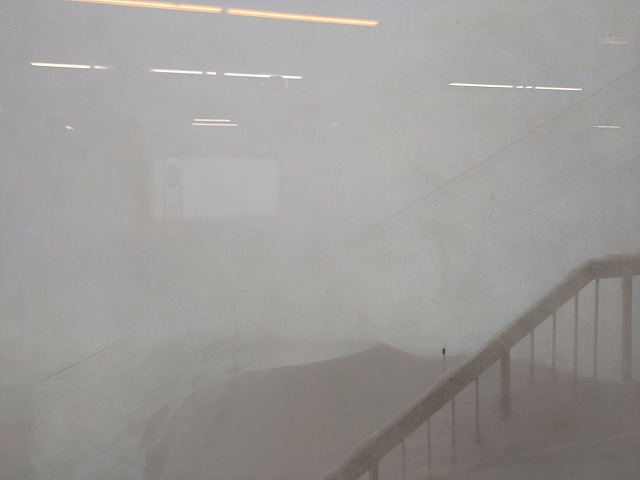 でもしかし、ここ千畳敷には特にウィンター関係の用具やアトラクションが用意されているわけでもありませんし、ガスっていて展望もよくないしということで、結局記念撮影後はさっさとぬくぬくホテル内へと戻ったのでありました。せめてプラそりでもあればなぁ(還暦越えの夫婦がそりでキャッキャやっていたらそれはそれでまた「異様な光景」なのかもしれませんが、あればやったと思います(苦笑))。 |