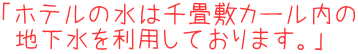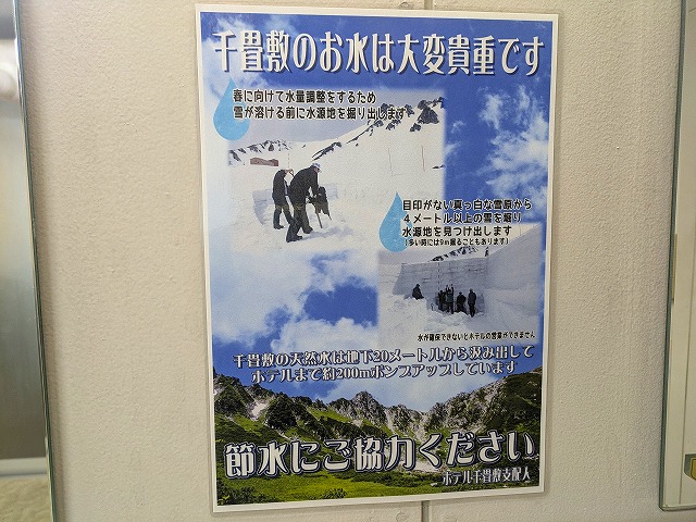 貴重な水でありお風呂の湯も当然循環していますが、前回同様カルキ臭は感じませんでした。まろやかな湯触りで、いかにも「天然水」というところでしょうか。 |