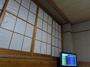 相変わらず階段の踊り場ガラスはゴーカイに積雪とのせめぎ合い具合を見せてくれています(前回もそうでした)。部屋に戻り寛いでいるとふと気になったのが「障子の貼り歪み」でありました。 |