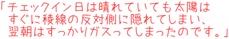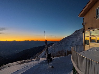 いっぽうで今回はチェックイン日(この日)こそ上部はガスっていましたが、天気予報によると「翌日のお天気は良好」との予報で、これは期待できるんじゃないかという感じでした。というかページトップ画像の通り翌朝のお天気はバッチリだったわけです(笑)。まぁお天気ばかりは運次第なのでラッキーでした。下手すりゃ両日とも吹雪だったりしてもおかしくないわけですし。 |