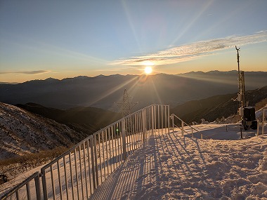 ちょうど南アルプスの間ノ岳と塩見岳を結ぶ稜線(ちょっと高度が下がる区間)の奥から富士山の頂が顔を出しています。ほぼ風も止んでおり、寒いことを除けば(これ重要)絶好のご来光見学日和の朝です。 |