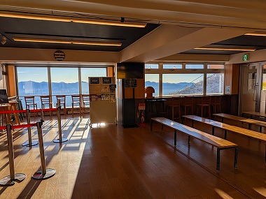 ということで朝ごはんを終えて部屋へ戻ります。この時間はまだロープウェイが動いていないので、ロビー周辺にも人の姿はなくのんびりとした雰囲気が漂っています。それにしても右上画像に見えているあの山々が「南アルプスのほぼ全山」なのですからたまげます(嬉)。 |