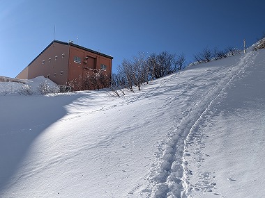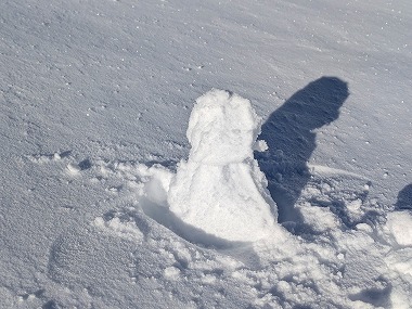 さらさらの乾雪でしたが何とか雪ちゃんも作った上でお宿へと戻ります。ツボ足で登りますがそこそこ足を取られて深みにはまりました。右足、まだ踏ん張りがきかないなぁ。 |