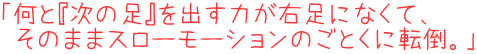 倒れていく間に自分でも「うそ、まさか!」とびっくりしていたくらいです。これが年を取るということなのでしょうがかなり悲しかったというか自信をなくした出来事でもありました。ふぅ。 |