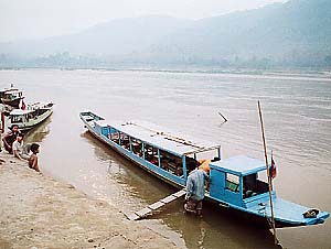 さて、托鉢の行列を見たあとは急いで屋台のサンドイッチ&豚マンをぱくついているうちに、昨日のうちに約束していたアンカーさんが宿まで迎えに来ました(8:00)。すぐ近くの船着き場まで一緒に歩き、いよいよメコン川クルーズ to Tamthin洞窟の始まりというわけです。アンカーさんの船が上の写真。結構大きくて(タムティン洞窟へ行く船は皆同じサイズだけれど)、これで二人で貸しきりかと思うと何だか嬉しくなるもんです。お値段のことは決めたことだからもういい。でも、空港から市内が乗り合いトゥクトゥクせいぜい20分で1人10000kipだったことを考えれば、丸々半日、しかも貸し切りメコン川クルーズ?で1人$7.5はそうも悪くないはずなのだと思うのだけれど。