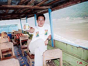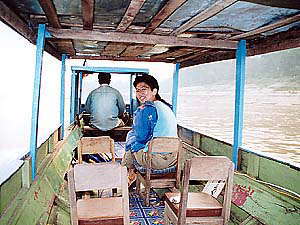 船内には何だか昔懐かしい、小学生向き木製の椅子(若い人は知らんでしょうな)の足を切ったような座席が並んでいます。数えてみたらたしか12席あったのですが、乾期の時期だから喫水が下がると危険なのか、それとも燃費が悪くなるのがいやだからなのか、「友達を連れてきても構わないけれど、4人までにしてくれよ」ということでした。でも、船の貸し切り料金ですから、4人なら1人$4弱。切り詰め系バックパッカーでもそれなら乗るんじゃないかな。他に行き方もないわけだし。