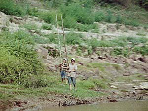 (右)川沿いの随所に見られた風景。老若男女を問わず棒を上にかざしてうろうろしているのは、