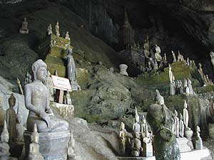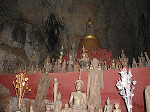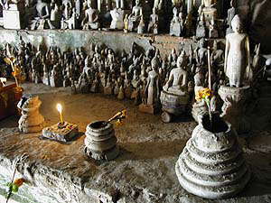 そしてわれらがアンカーさんの船はタムティン洞窟へ到着。ここまでは正味1.5hくらい。洞窟上陸用の浮き桟橋は結構小さくて、そこにうちらのような船がごちゃまんと強引に着岸しているという感じです。ここは見学料として8000kipが必要です。階段を上がっていくと供物を売るおばちゃん(我々が行くまではうたた寝してましたが、客の気配ありと見るや「はぁ〜い花はいらんかねぇ」といった感じに居ずまいを正しておられました)がいたりします。せっかくなのでお供えしてきました。
