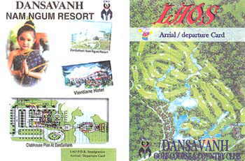 さて、ラオスのイミグレで出国手続きをします。とはいってもわれわれはすでに出国カードを持っていたのでそれを提出すれば終わりなのですが、でも係員の人がご丁寧に新しいのをくれたので何げなく見てみると、何と裏面(表紙?)にはカラー印刷でラオス国内のリゾート施設の広告が印刷されているではありませんか。どうやらゴルフ場まであるみたいですが、それにしても、この広告を見て「よっしゃ、このリゾートに行くぞ!」と思い立つ旅行者なんてほとんどいないんじゃないかなあ。しかし、社会主義国のはずなのに、妙にこんなところがバリバリの資本主義国なのね(笑)。