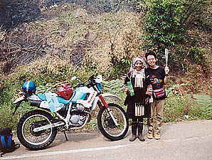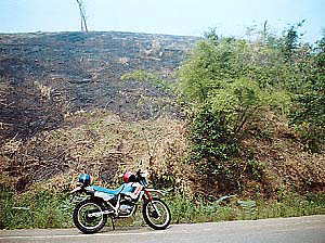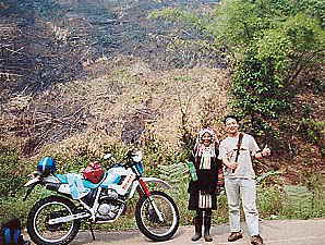 しかし、かなり走ったところでひょんな人に出会いました。このあたりは山岳民族の人たちが住んでいるエリア。彼らは焼畑農業で生計を立てているわけで、この時期はまさに畑を焼く時期。沿道にはところどころ黒こげになった小山が出てきたりするんです。そんなわけでバイクを停め、そんな風景をカメラに収めていたりしたら、どこからか歌声が聞こえてきました。