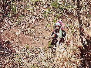歌声はどこからか聞こえてきます。日本でいえば田植え歌といった感じの、スローテンポののんびりした曲です。丘全体を見渡して歌声の主を何とか探し出そうとするTakema&おしんこどん。そしたら‥いましたいました。結構近いところでナタをふるって焼け残りの草をはらっている、アカ族のおばさんでした。