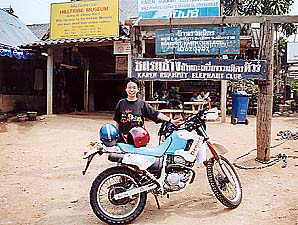 さて、今日は夕方前の飛行機でバンコクに戻らなけりゃいけないんです。そして今日のうちに日本に向けて飛び立つのだから、いよいよこの旅行も終盤戦ということですな。しかぁ〜し!そう簡単には帰ろうとしないのが我々。朝から午後2:00頃までは遊べるのだから、その時間を無駄にするのはあまりにももったいない。というわけで、朝には、昨夜のチェックイン時に話をしておいたレンタルバイクが早速登場!お約束の「デポジット=パスポート」も、慣れてしまえば違和感もないんです。