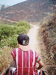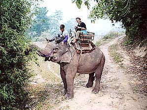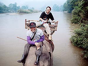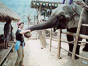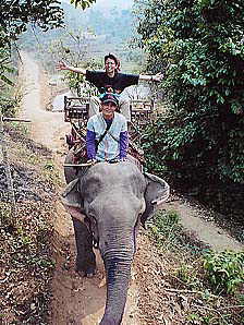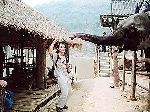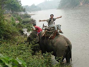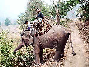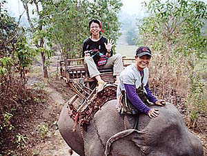 ゾウ乗りの料金は高騰してました。1996年の倍(96年:200B、02年:400B。いずれも1hコースの料金)でした。なるほど、舗装道路もできて団体客も来るようになったし、観光地値段になってきたということのようですな。しばらく前にあったアジアの通貨危機の影響もないわけじゃあないでしょうが、維持費といえばゾウの食い物代くらいなもので、それなら昔から現地調達していたはずですからあまり理由にはならないですな。まぁせっかく来たんだし、ここは日本円に換算して「安いじゃないか」と思うことにしました。しかも1人1象にしましたから、昨日の宿(2人で160B)を考えたらえらく高いお値段ですが、まぁ仕方ないか。