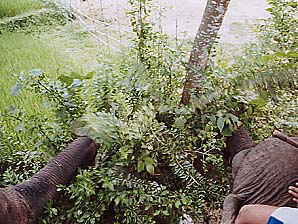 これもまたつまみ食いの途中です。今度は少し高い位置の葉っぱに手ならぬ鼻を出してみたようですが、このあと思いも掛けぬアクシデント発生!上の写真にマウスオンしてみてください。象使いさん、果たしてどうなる?あ〜あ、象の頭に乗っていたのに、後ろ側にこけちゃいましたね。一同大笑い。