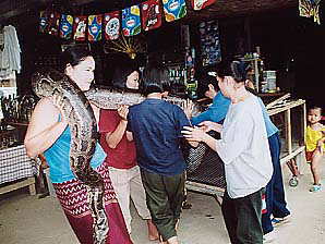 そう、これ@大蛇でございます。しっかし、Takemaもいろんな所でヘビを巻かせようとする商売人を見たことがあるけれど、ここのはぶっとい!サイズからして違うのですよ。上の写真だけ見るとそう太いようには見えないんだけれど、中下半身あたりの太さは見事というか圧巻です。ヘビ巻き100Bというのはとてつもなく高いですが、それにしてもたまげました。
