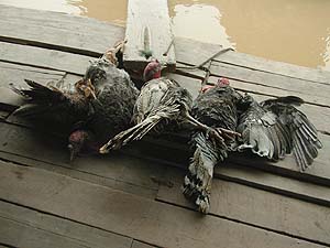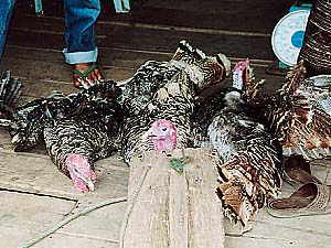 別の船でトリさん3匹が縄にくくられて到着しました。しばしはこのままおとなしくしていましたが、そのうち1匹が縄抜けの術を体得して逃げようとしたらしく、持ち主その他があたふたして何とかして取り押さえました。